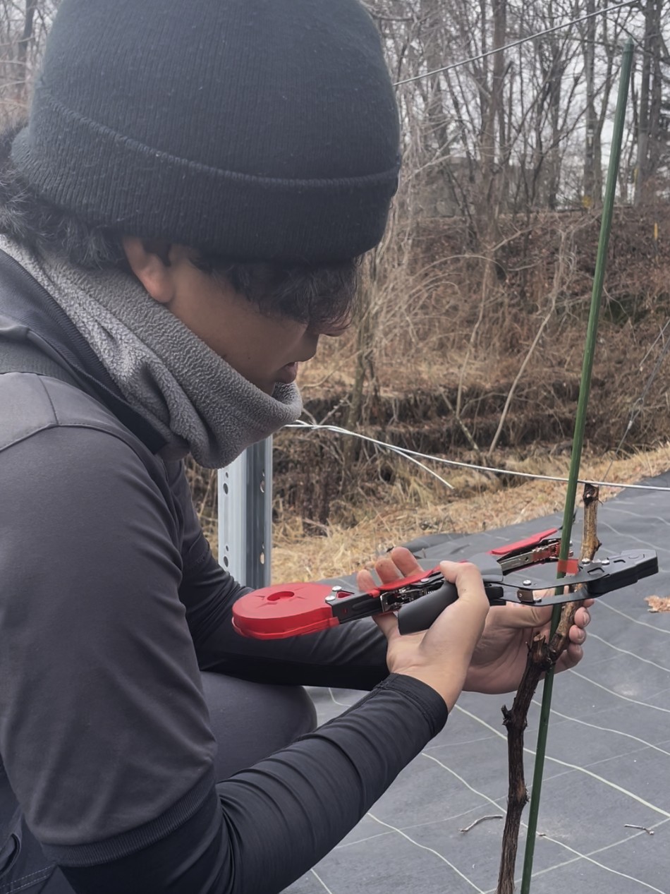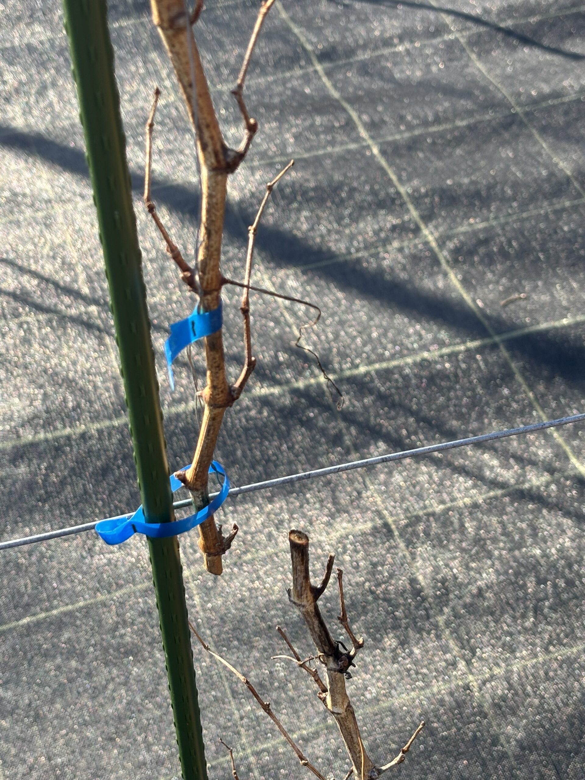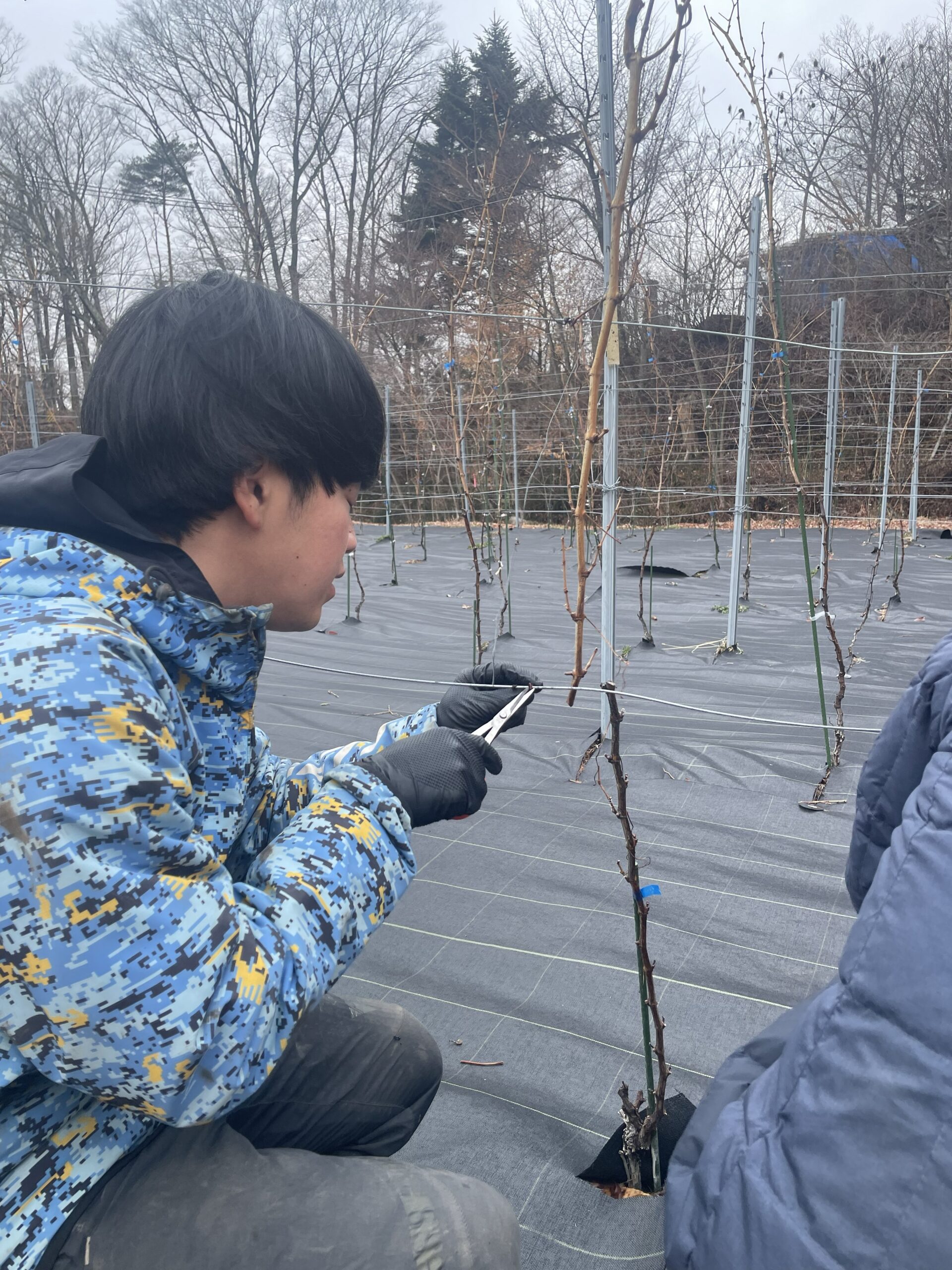 さらに、ブドウの樹形がまっすぐ整うように、剪定後の苗木を支柱へ誘引し、今後の生育に備えました。